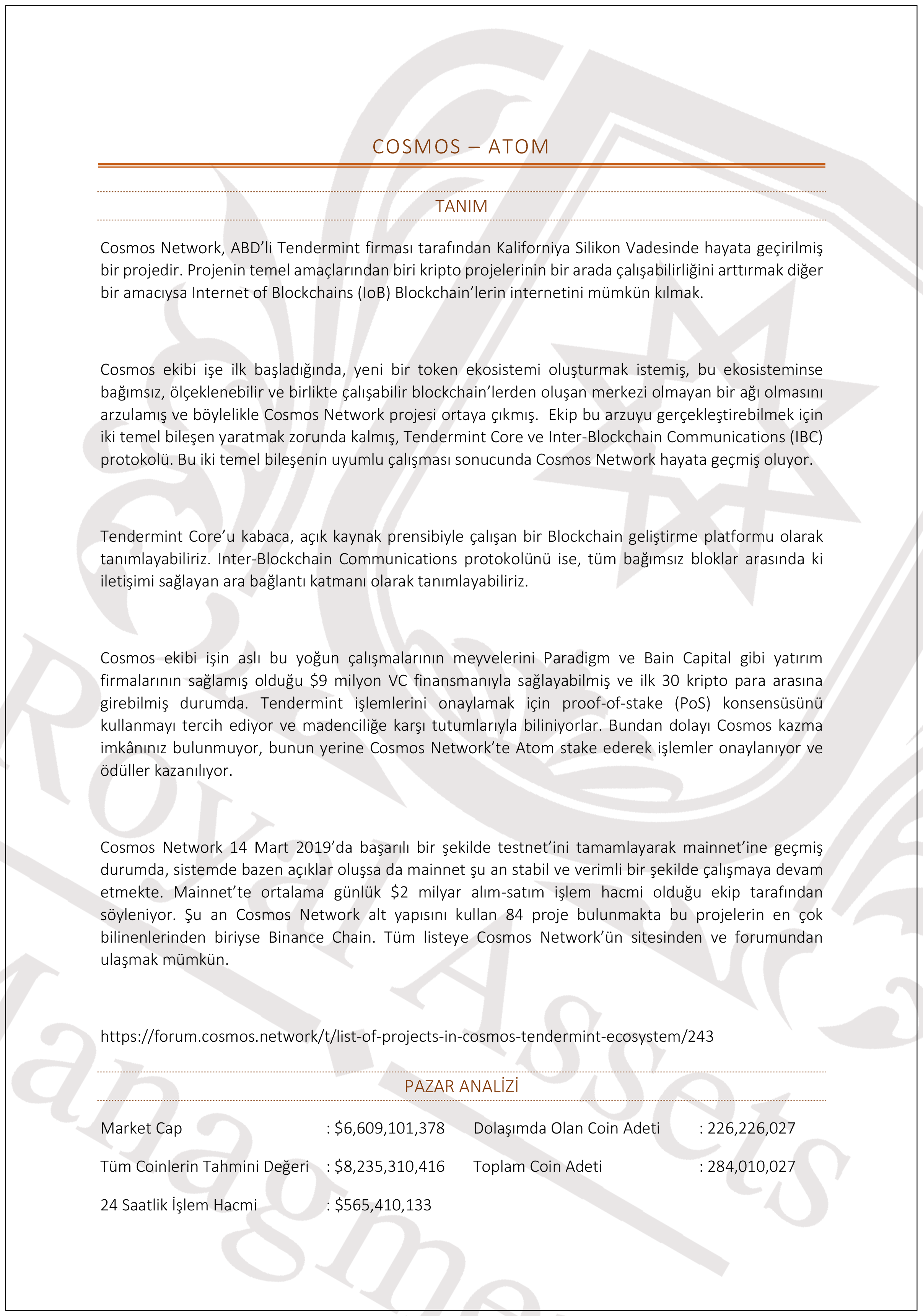 Cosmos Network, ABD’li Tendermint firması tarafından Kaliforniya Silikon Vadesinde hayata geçirilmiş bir projedir. Projenin temel amaçlarından biri kripto projelerinin bir arada çalışabilirliğini arttırmak diğer bir amacıysa Internet of Blockchains (IoB) Blockchain’lerin internetini mümkün kılmak.