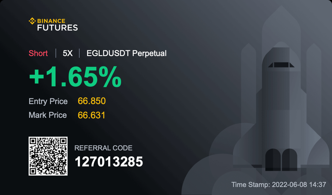 Akselito’nun ücretli olarak 8 Haziran 2022 tarihi 14:02 saatinde gönderdiği EGLD / USDT pozisyonunu takip ettim ve % 1,65 (5 kaldıraçla) kâr ettim.