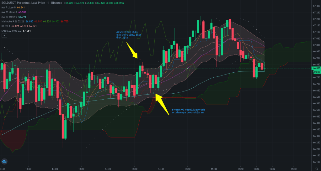 Gördüğünüz gibi skorun geldiği anda EGLD’nin fiyatı Keltner bandının üzerinde olduğunu okuyorum, Akselito $ 66,33 seviyesinden girmemi tavsiye etmiş olsa da fiyatın bir miktar daha yukarı atacığını tahmin ediyorum. Çünkü Commoditiy Chanel Index (CCI) halen 100’ün üzerine çıkmış durumda değil, CCI ile short yönlü işleme girileceği zaman CCI’nın 100’ün üzerinde olmasına özen gösteriyorum. 1 dakikalık grafikte pozisyonu incelemeye devam ettiğimde aynı mum içinde fiyat tepe noktaya geliyor ve satıcılar fiyatı baskılıyor. Bunu da mum formasyonundan rahatlıkla okuyabiliyoruz.